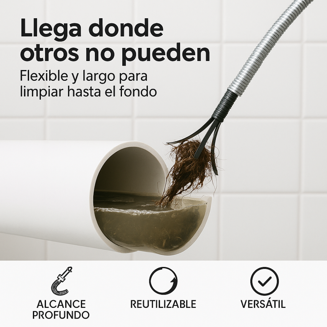 Además de ser corrosivos, contaminan y muchas veces no remueven el problema de raíz. Con esta herramienta, limpias directamente el foco del atasco.