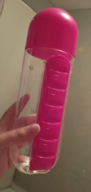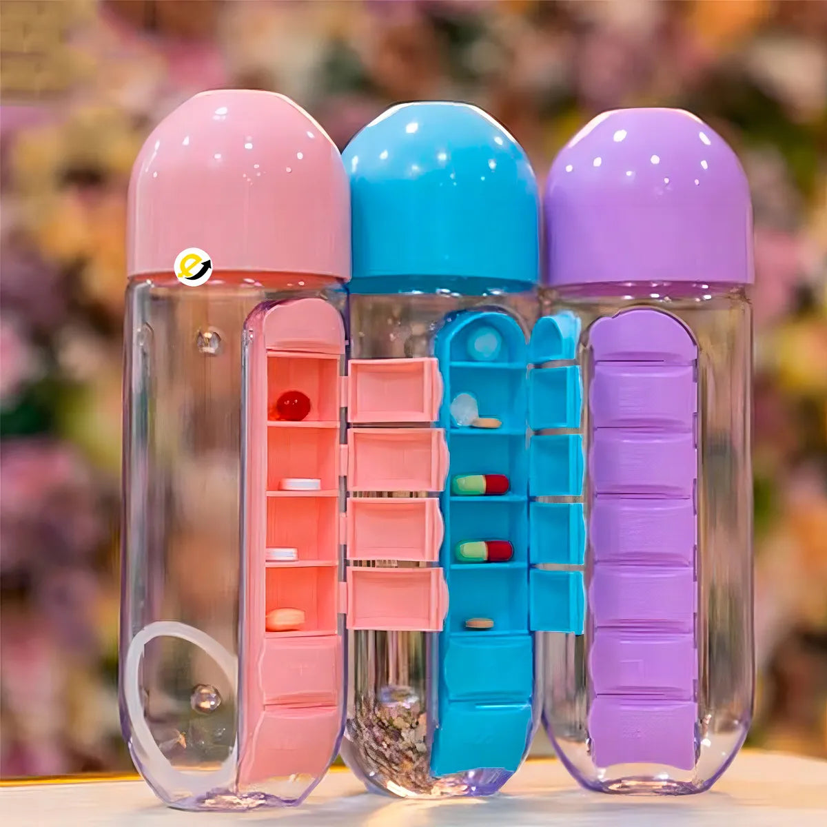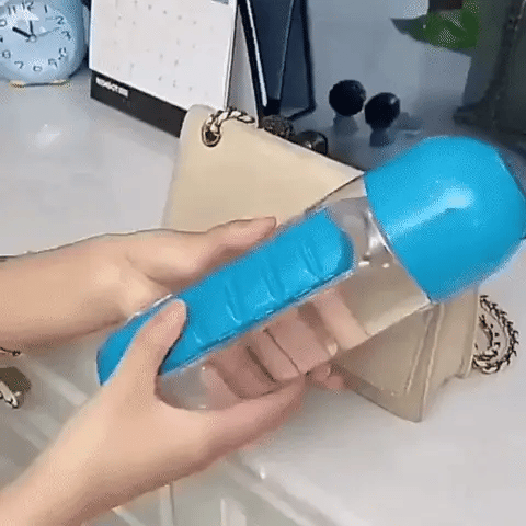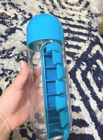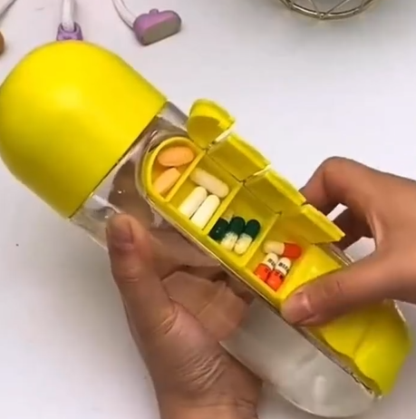 Con esta botella todo en uno, llevas agua, pastillas y taza sin cargar más de la cuenta.