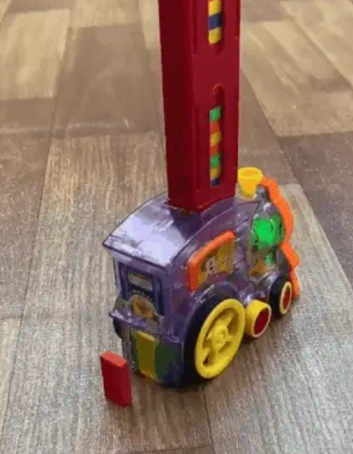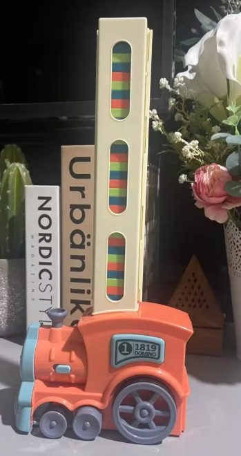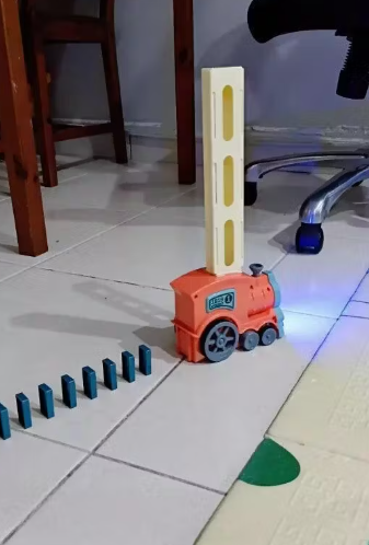 Este tren coloca fichas de dominó solo y crea un espectáculo que sorprende a niños y adultos.